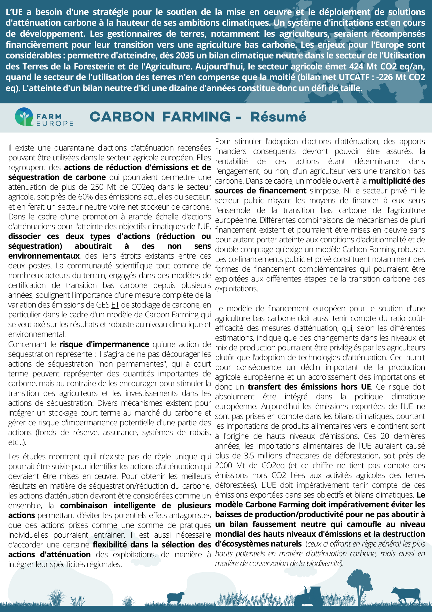 Dans le cadre d’une promotion à grande échelle d’actions d’atténuations pour l’atteinte des objectifs climatiques de l’UE, dissocier ces deux types d’actions (réduction ou séquestration) aboutirait à des non sens environnementaux, des liens étroits existants entre ces deux postes. La communauté scientifique tout comme de nombreux acteurs du terrain, engagés dans des modèles de certification de transition bas carbone depuis plusieurs années, soulignent l’importance d’une mesure complète de la variation des émissions de GES ET de stockage de carbone, en particulier dans le cadre d’un modèle de Carbon Farming qui se veut axé sur les résultats et robuste au niveau climatique et environnemental.